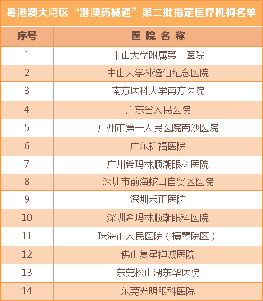 为深入推动粤港澳大湾区药品医疗器械创新发展,更好服务我省卫生健康高质量发展战略,根据国家和省委省政府关于实施“港澳药械通”系列工作要求,释放更多政策红利,经征求省药监局意见,我委审核研究决定,在粤港澳大湾区内地实施“港澳药械通”的第二批指定医疗机构为中山大学附属第一医院、中山大学孙逸仙纪念医院等14家医疗机构(名单详见附件)。现将有关要求通知如下: