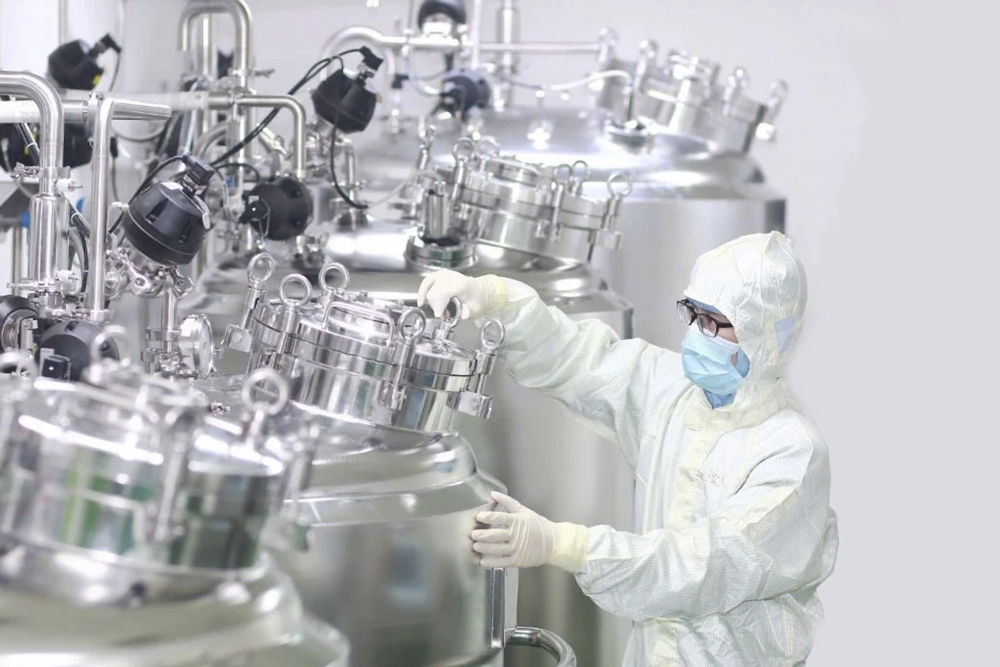 2021年10月27日,工作人员在丽珠医药集团的生物制剂生产车间配液。新华社发