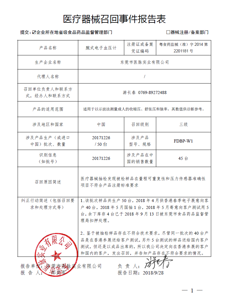 东莞市医脉实业有限公司报告,该公司生产的腕式电子血压计经检验,不符合标准规定。东莞市医脉实业有限公司主动召回有关产品,召回级别为三级。涉及产品的型号、规格及批次等详细信息见《医疗器械召回事件报告表》。